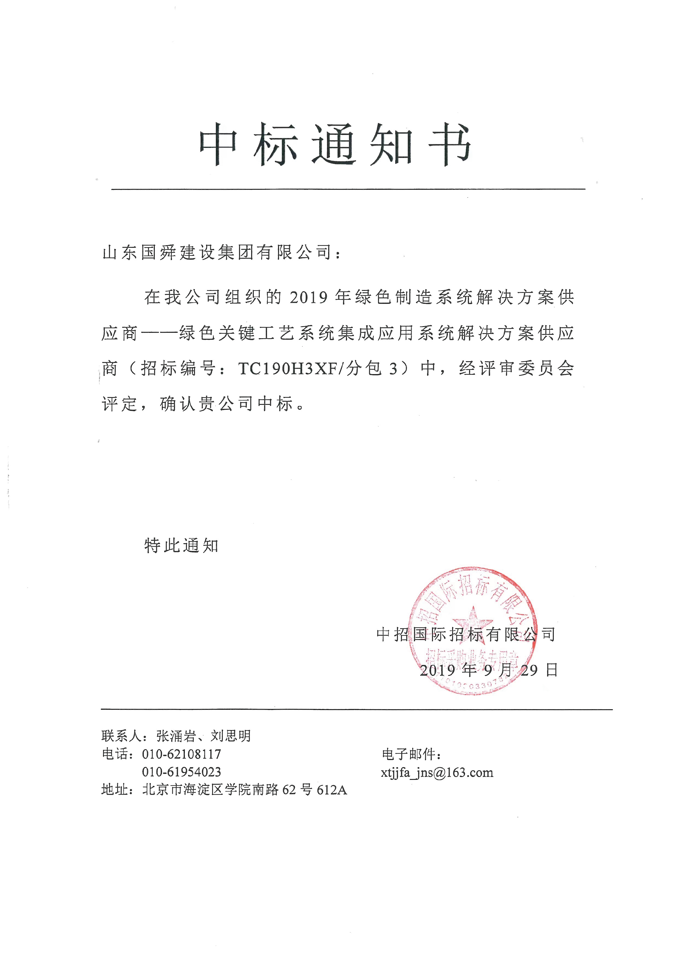 2019年9月,国舜集团中标工信部绿色制造系统解决方案供应商