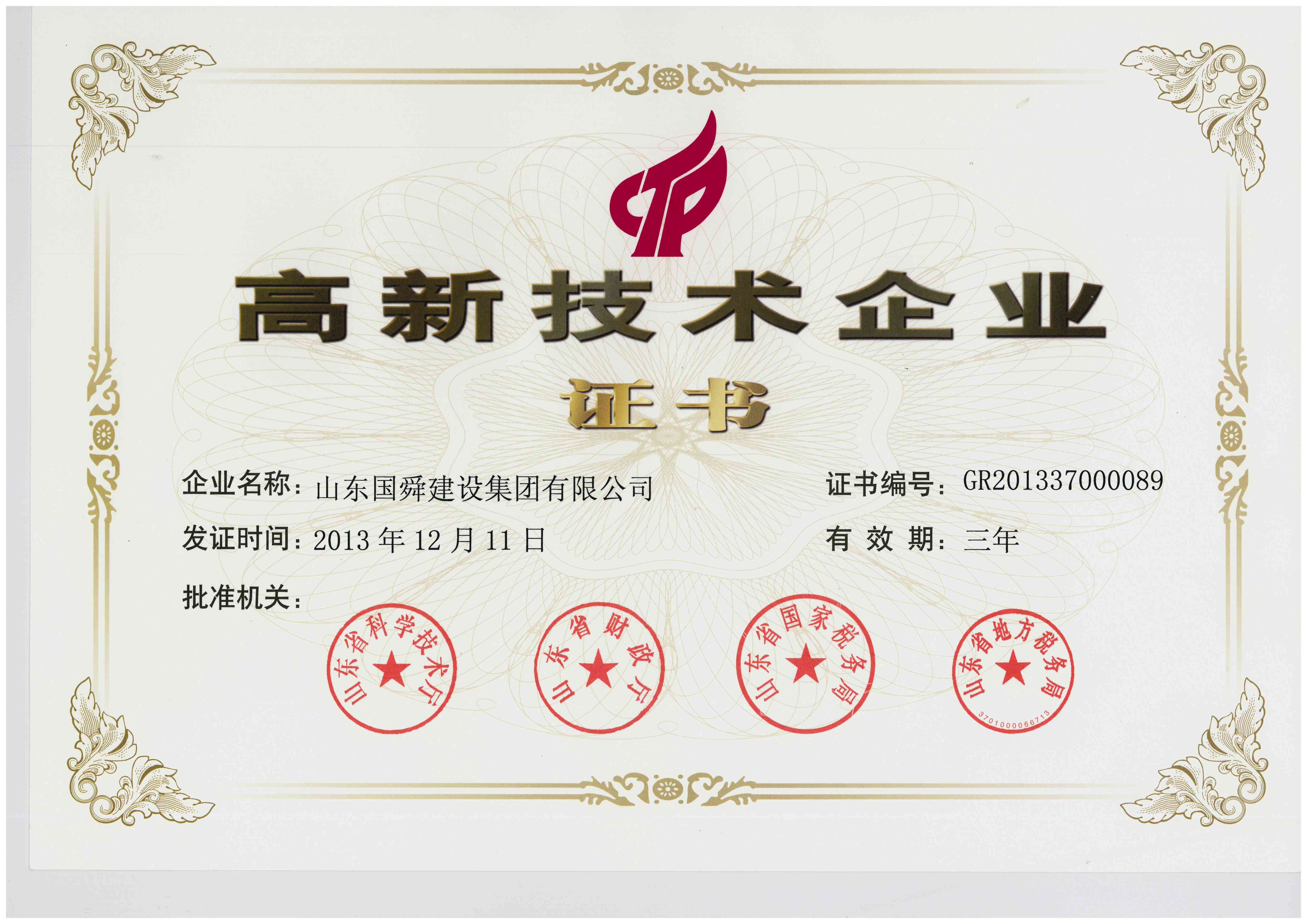 2013年12月,经国家科技部批准,国舜集团被认定为“国家高新技术企业”