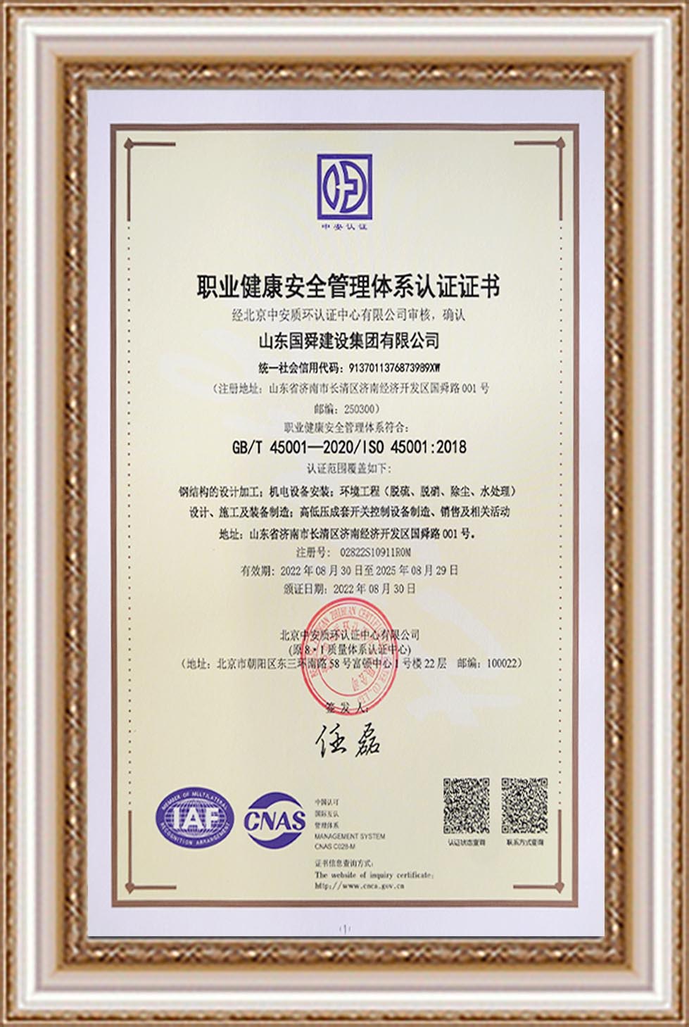 职业健康安全管理体系认证证书