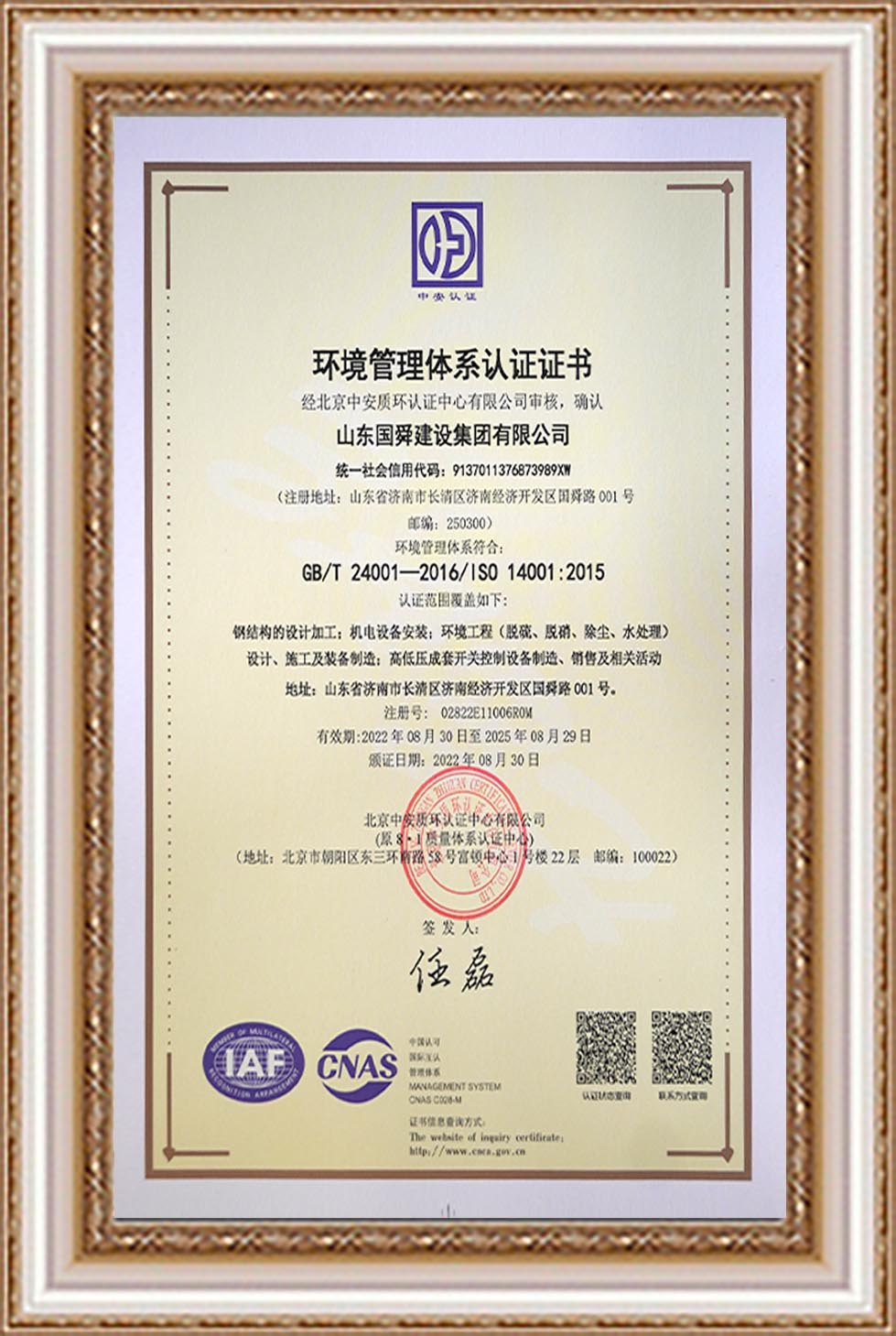 环境管理体系认证证书
