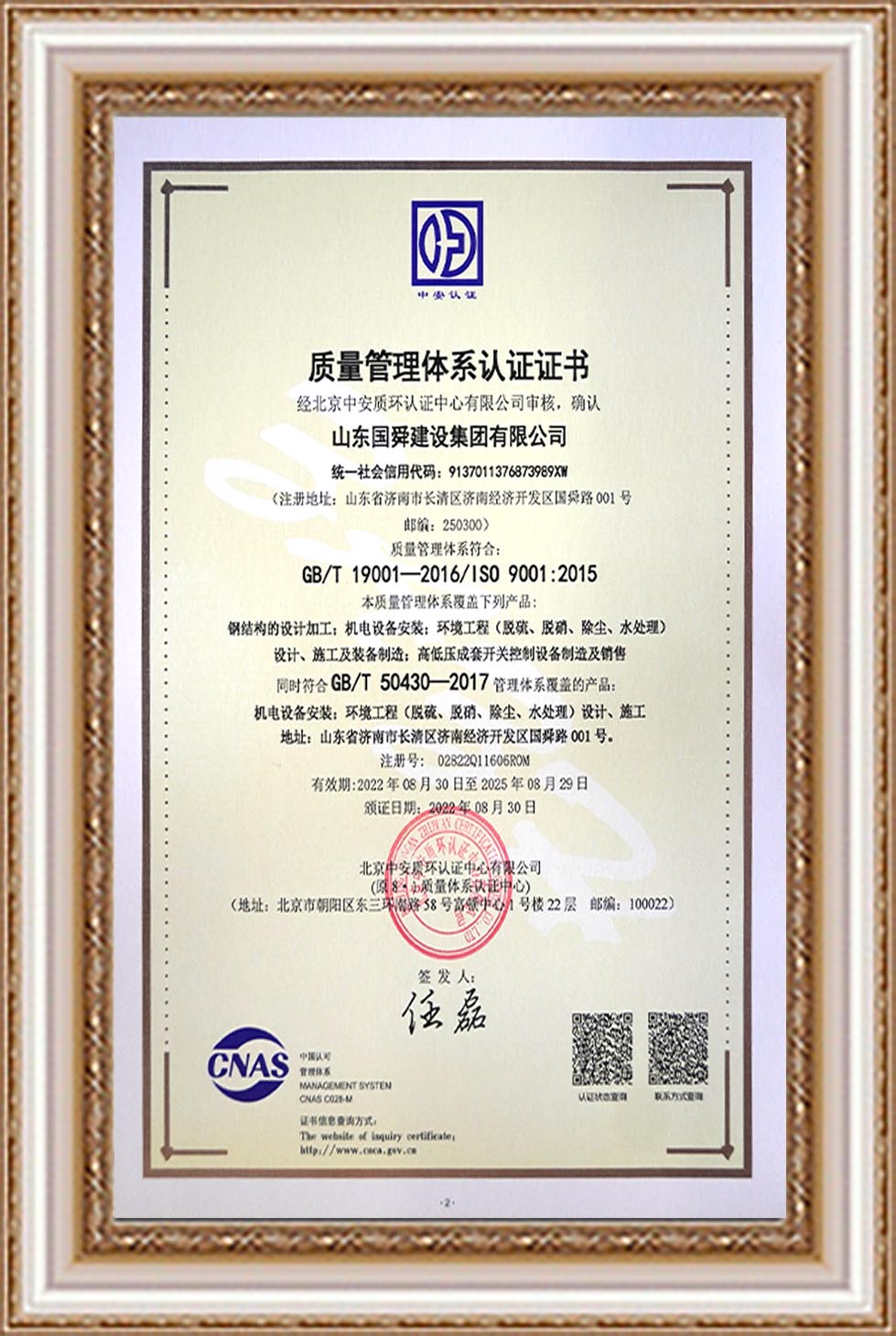质量管理体系认证证书