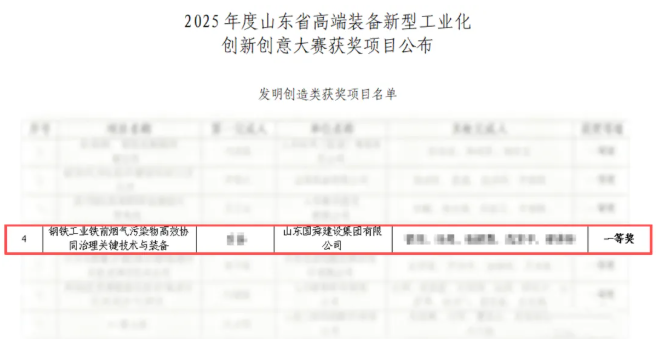 2025年12月13日-14日,由山东省工信厅、山东省总工会联合主办,山东省装备制造业协会、山东省国防机械电子工会委员会承办的2025年度山东省高端装备新型工业化创新创意大赛成功举行。国舜集团钢铁工业铁前烟气污染物高效协同治理关键技术与装备项目荣获发明创造类一等奖。