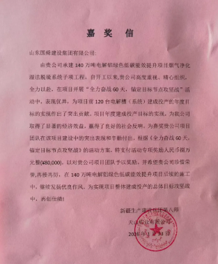 近日,国舜集团天山铝业项目部收到了来自业主单位新疆生产建设兵团第八师天山铝业有限公司的嘉奖信,对项目团队在“140万吨电解铝绿色低碳能效提升项目”烟气净化湿法脱硫系统子项工程中的突出表现予以表彰,并给予专项奖励8万元。