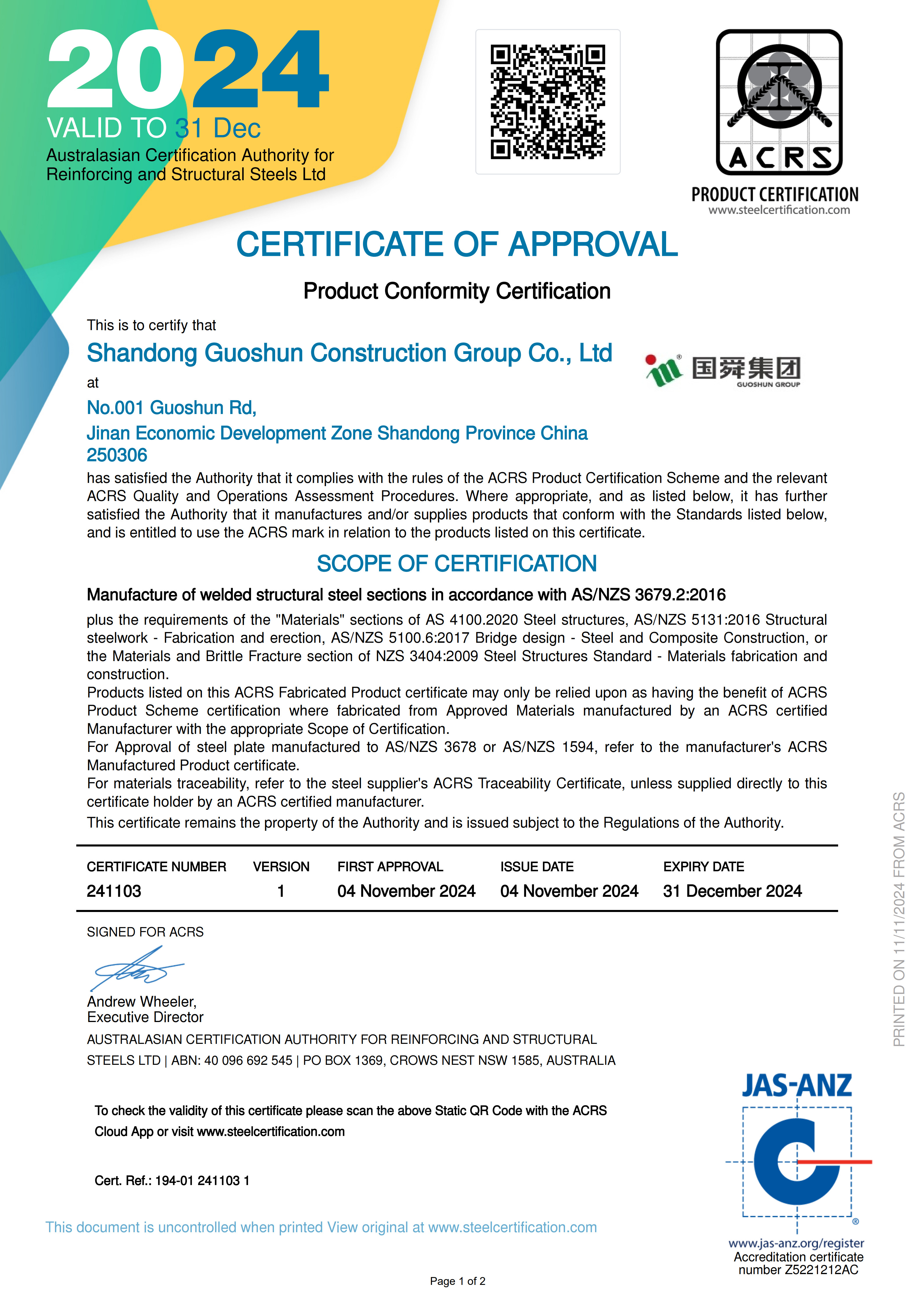 ACRS(Australasian Certification Authority for Reinforcing Steels,澳大利亚与新西兰钢筋和结构钢认证机构)认证,是澳大利亚和新西兰建筑及基础设施行业对钢材产品质量的权威认证,对于钢材的化学成分、力学性能、尺寸公差、冶金结构、焊接工艺以及表面处理等均有严格的规定。作为首家通过ACRS 3679.2认证的中国企业,国舜集团生产的焊接H型钢产品完全符合AS/NZS 3679.2:2016标准,可以满足澳大利亚和新西兰市场对钢材质量的严格要求,产品质量已达到国际领先水平。